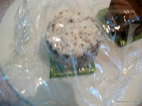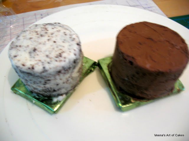 Some times I just use left over foam pieces and make mini boards for my mini cakes. - Place a spoon full of melted chocolate on the coaster or mini board, place the cake on it. And let it set in the fridge for a few minutes.